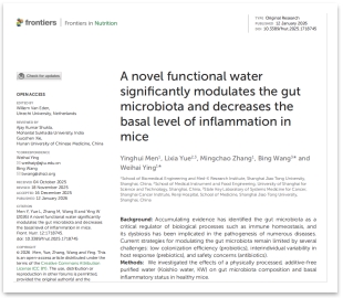 *摘要出自论文《A novel functional water significantly modulates the gut microbiota and decreases the basal level of inflammation in mice》,发表于期刊《Frontiers in Nutrition》,第一作者门盈辉,通讯作者殷卫海