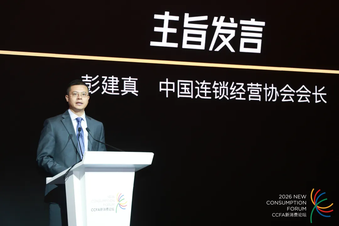 中国连锁经营协会会长彭建真代表主办方致辞。他首先分析了行业基本态势:2025年全国餐饮收入达5.79万亿元,同比增长3.2%,增速明显放缓,行业从增量扩张转向存量博弈。连锁化率从2023年的21%提升至2025年的25%,101-500家及501-1000家店的中等规模品牌成为增长主力,饮品品类连锁化率高达54%,是连锁化提升的核心推手。